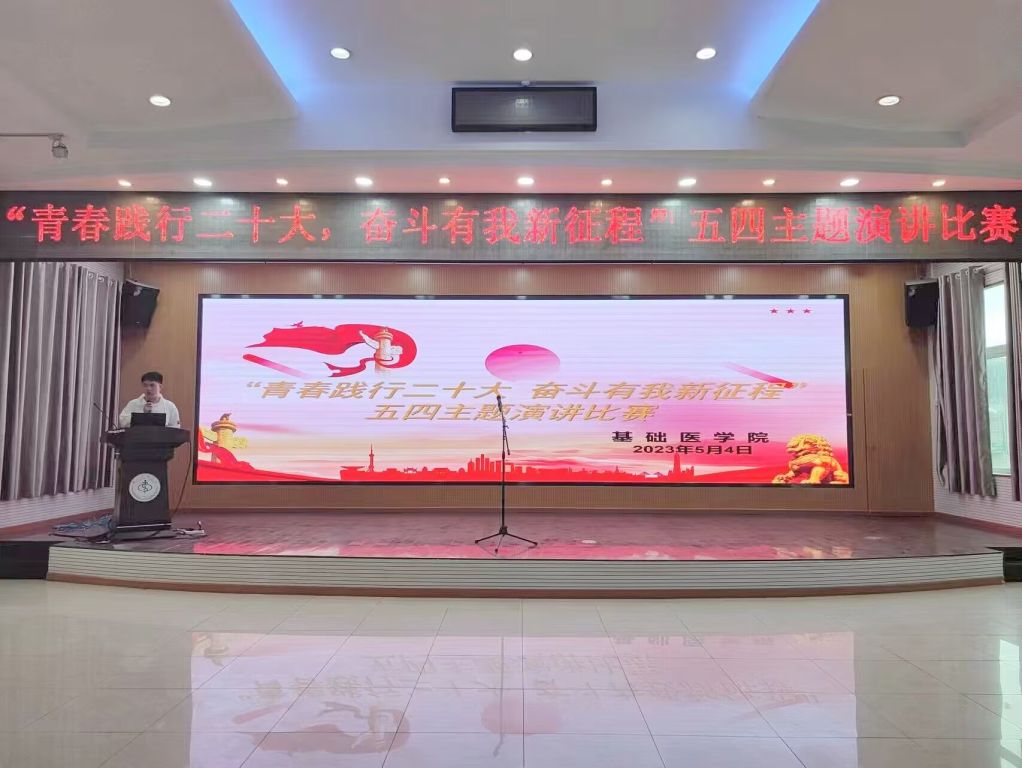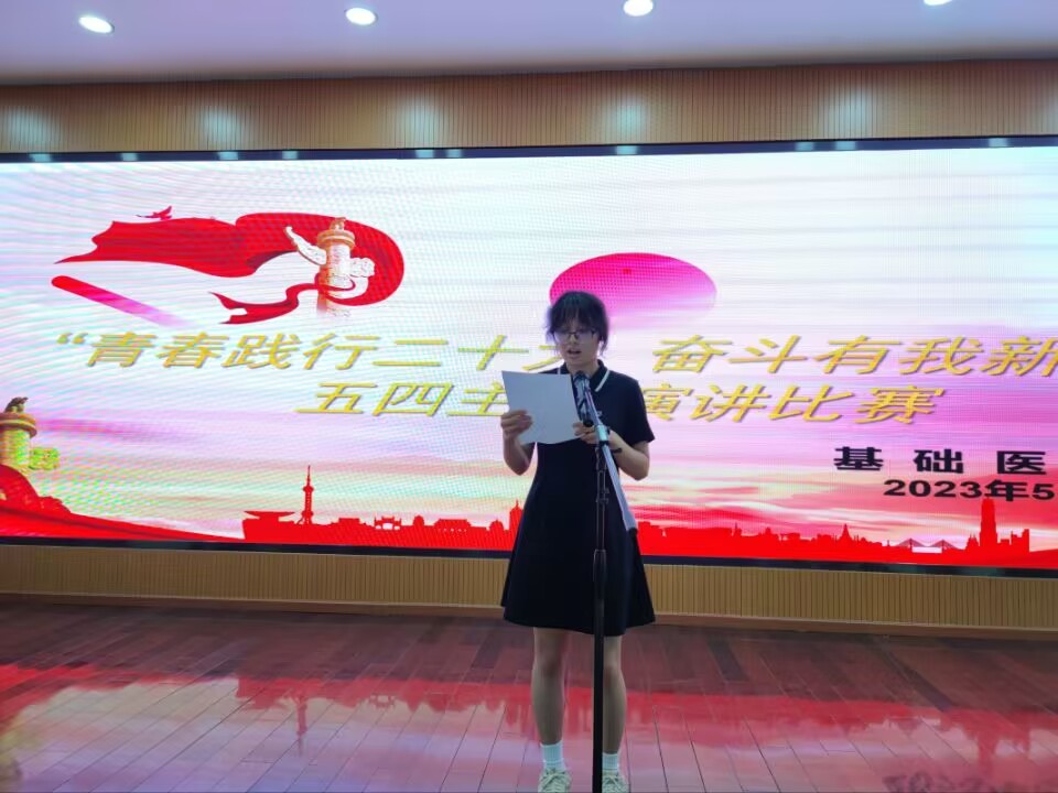 比赛在主持人慷慨激昂的开场白后正式拉开帷幕,9位参赛选手在演讲中不仅回顾了五四运动的历史事件,还结合个人实际情况抒发爱国情感,将个人成长融入祖国发展、民族复兴。来自药护2022临本6班的廖杨同学以“穿越时空”的方式,把革命英雄与当代青年做对比,激励广大青年学子汲取“五四”力量,坚定理想信念,践行青春使命。来自2022生物医学科学班的杨培琼同学以“以青春担使命,尽责任展风采”为主题,号召青年学生用青春与热血肩负时代使命、勇毅前行,一句句铿锵有力的“请党放心,强国有我”引起全场学生共鸣!