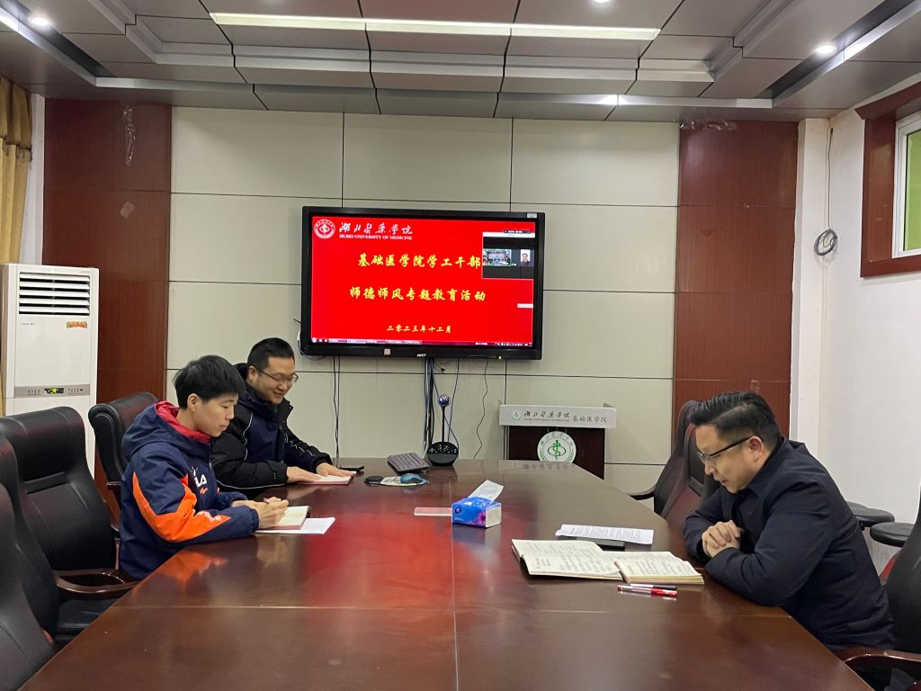 本网讯(通讯员 饶悦)12月21日上午,beat365官网联合第六临床学院以线上线下相结合的方式,在1号楼1楼会议室开展学工干部师德师风专题教育会议。