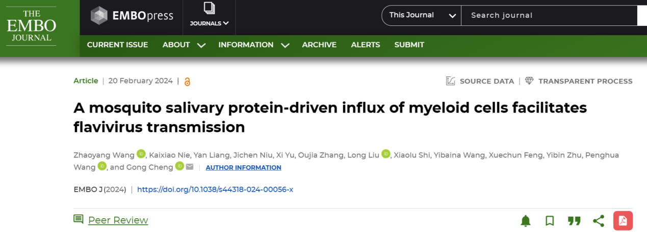 此外,刘龙博士参与清华大学程功教授蚊媒病毒相关项目也取得了新进展,该研究鉴定了一种蚊子唾液蛋白AaNRP可以促进寨卡病毒和登革病毒传播,白藜芦醇可抑制该蛋白下游信号通路的激活,提出了潜在的蚊媒病毒预防策略。该成果将在2024年5月以封面文章发表于欧洲分子生物学组织(EMBO)旗下期刊The EMBO Journal(中科院1区Top)。