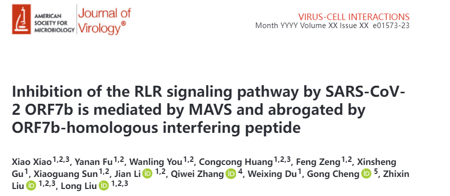 本网讯(通讯员付亚男肖潇)近日,病毒学十堰市重点实验室(beat365官网病毒学研究所)刘龙团队在美国微生物学会(ASM)旗下期刊Journal of Virology(中科院1区Top)在线发表了题为Inhibition of the RLR signaling pathway by SARS-CoV-2 ORF7b is mediated by MAVS and abrogated by ORF7b-homologous interfering peptide的研究论文。该研究揭示了新冠病毒蛋白ORF7b拮抗宿主天然免疫的机制、以及靶向ORF7b干扰肽的潜在治疗效果。