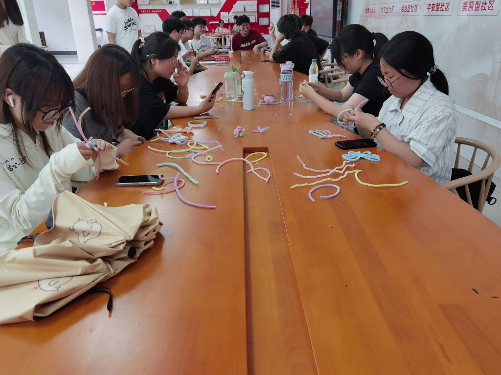 在同学们热烈的欢呼声中,“谁是卧底”游戏拉开序幕,玩家们认真思索自己手中的词语后进行精确的描述,并通过场上玩家的发言判断自己的身份,充分展现了同学们的敏锐观察与快速表达能力。另一边,“扭扭棒DIY”活动组织者将五颜六色的扭扭棒分发给大家,大家跟着视频一扭一捏,一卷一折,灵巧的双手和丰富的想象力将扭扭棒编织出各种各样的物品,大家一边做手工,一边交流,现场气氛十分活跃。