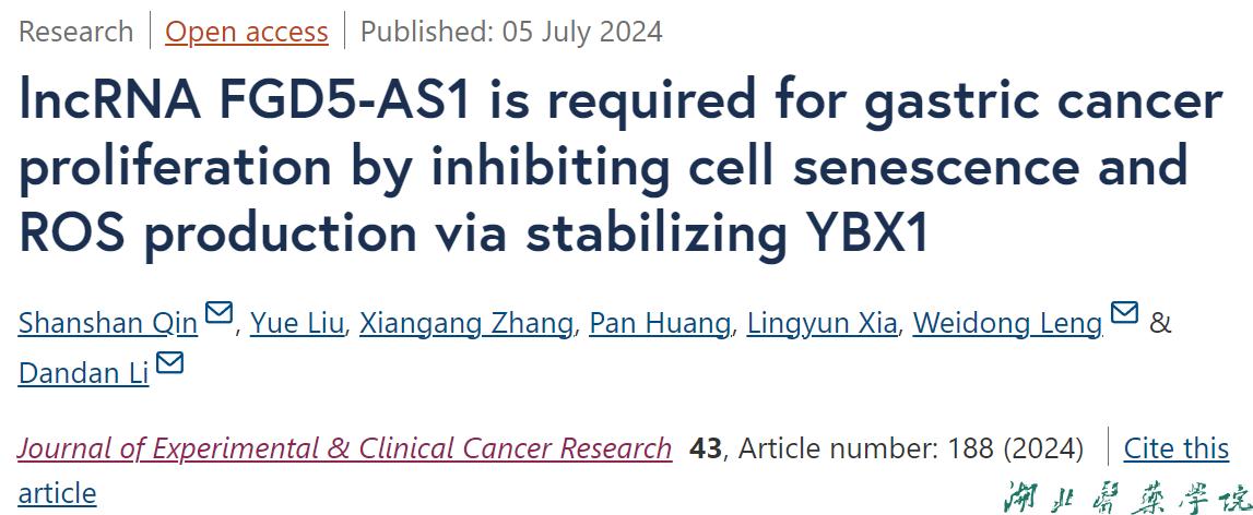 beat365官网钦闪闪团队的研究方向长期聚焦于胃癌领域。近日,该团队在Journal of Experimental & Clinical Cancer Research期刊发表了题为lncRNA FGD5-AS1 is required for gastric cancer proliferation by inhibiting cell senescence and ROS production via stabilizing YBX1的研究论文。
