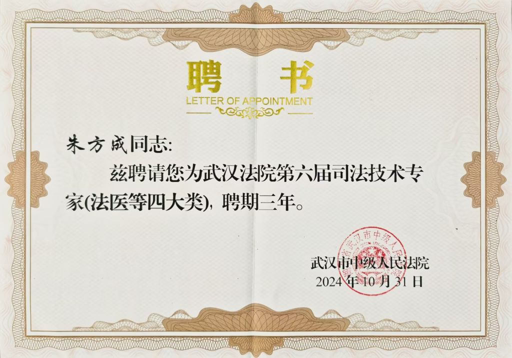 鉴定所所长朱方成因业务能力突出,被武汉市中级人民法院聘请为武汉法院第六届司法技术专家(法医等四大类)。