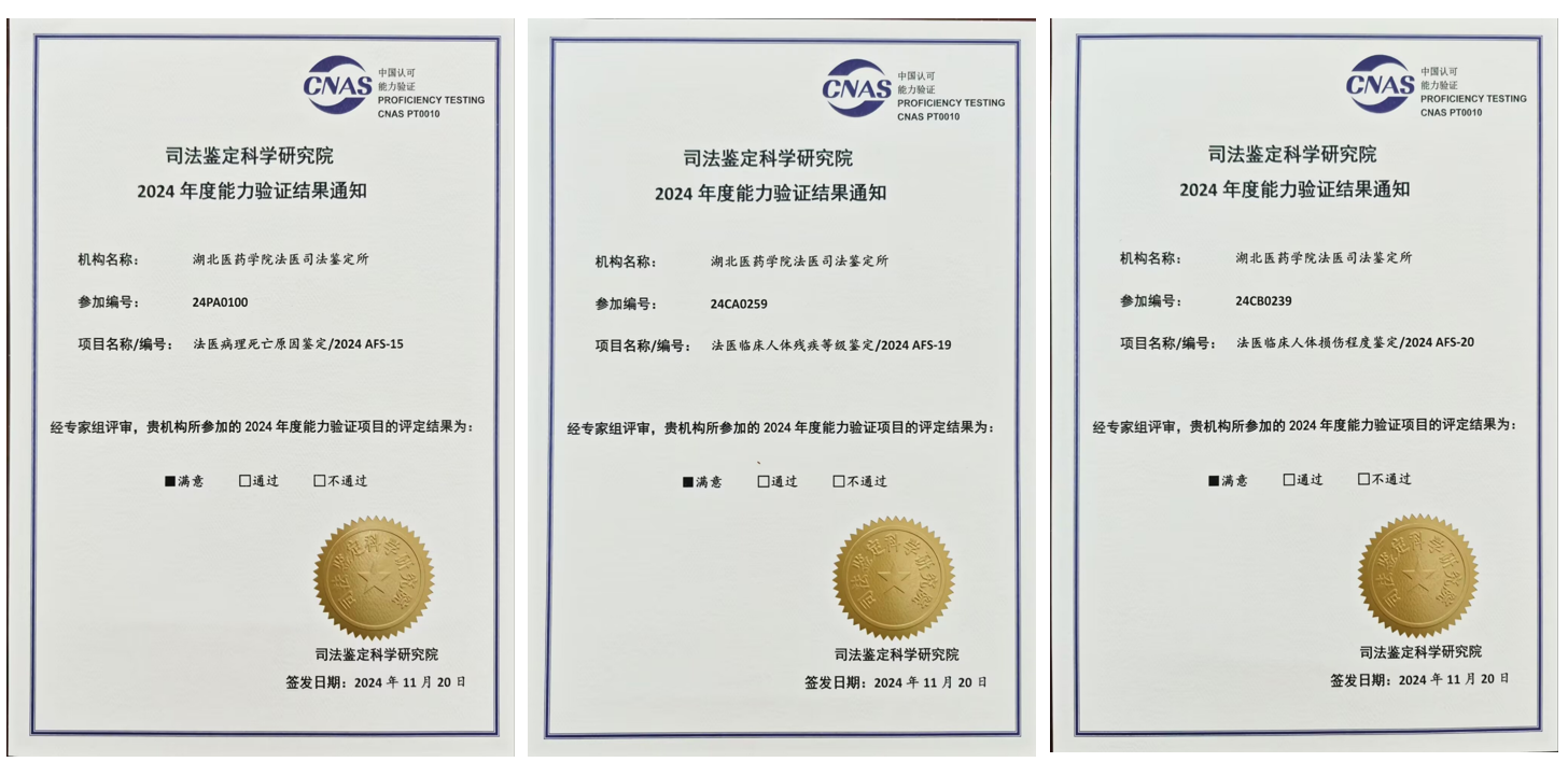 本网讯(通讯员何志凯)近日,beat365官网法医司法鉴定所在参加由司法部司法鉴定科学研究院组织的2024年度三项能力验证项目评定中,获评全部“满意”结果。