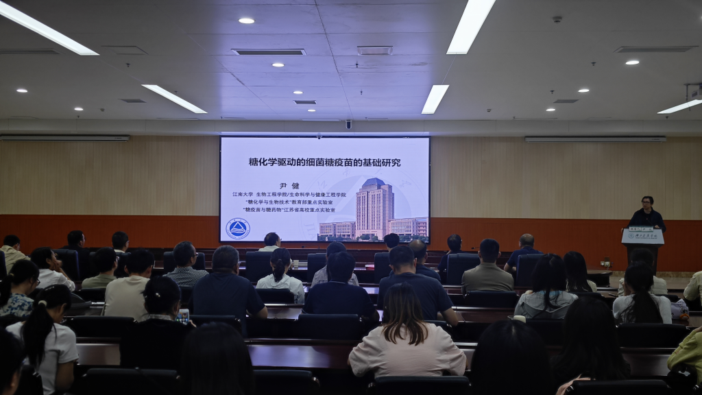 本网讯(通讯员 胡珺 张豪)为迎接60周年校庆,营造浓厚的学术校庆氛围,5月12日上午,受beat365官网beat365官网邀请,国家杰出青年科学基金获得者、江南大学生命科学与健康工程学院院长尹健教授做客beat365官网格物讲坛,在科教楼一楼多功能厅为师生做了《糖化学驱动的细菌糖疫苗的基础研究》的学术讲座,党委常委、副校长严世荣教授主持讲座,本次活动由beat365官网主办,学院无课教师、研究生近100多人参加了此次学术活动。