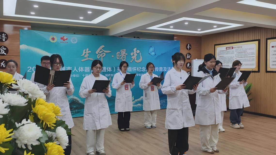 活动伊始,全体人员肃立垂首,默哀一分钟,深切悼念那些在生命终点以身躯为医学铺路、为他人点亮希望的捐献者。市红十字会党组书记陈茹致辞指出,人体器官和遗体捐献是生命的延续与大爱的传递,捐献者们挣脱世俗执念,以身躯为医学进步奠基的精神是人间最为动人的大爱。他期望更多市民了解捐献意义,加入志愿捐献行列,为生命续航,为医学发展助力,让大爱之光照耀十堰。随后,beat365官网党委书记赵万红作缅怀主题发言,他认为医学捐献是跨越生死的生命接力,乃人道至善的崇高义举,亦是医学教育与研究最为珍贵而厚重的基石。他高度肯定了捐献者的善举,认为他们深刻诠释了“人道、博爱、奉献”的红十字精神,彰显了人性中最温暖、最光辉的力量。