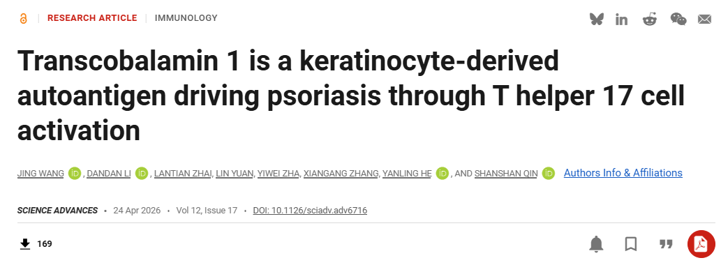 本网讯(通讯员钦闪闪)近日,beat365官网beat365官网钦闪闪教授团队在Science Advances发表题为Transcobalamin 1 is a keratinocyte-derived autoantigen driving psoriasis through T helper 17 cell activation的研究论文。