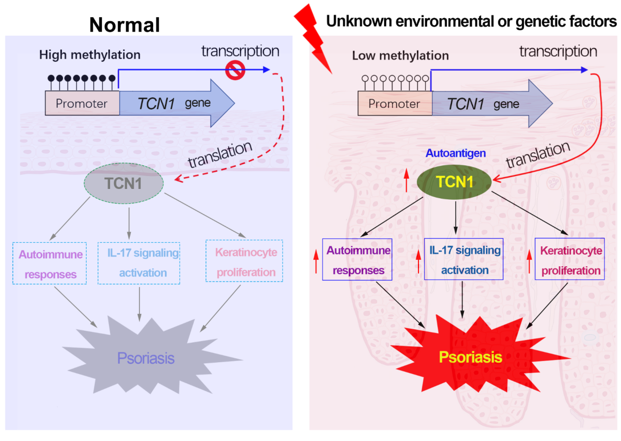 在正常皮肤中TCN1基因几乎不表达,但在银屑病皮损中因启动子区DNA低甲基化而被异常"唤醒",表达量显著升高。